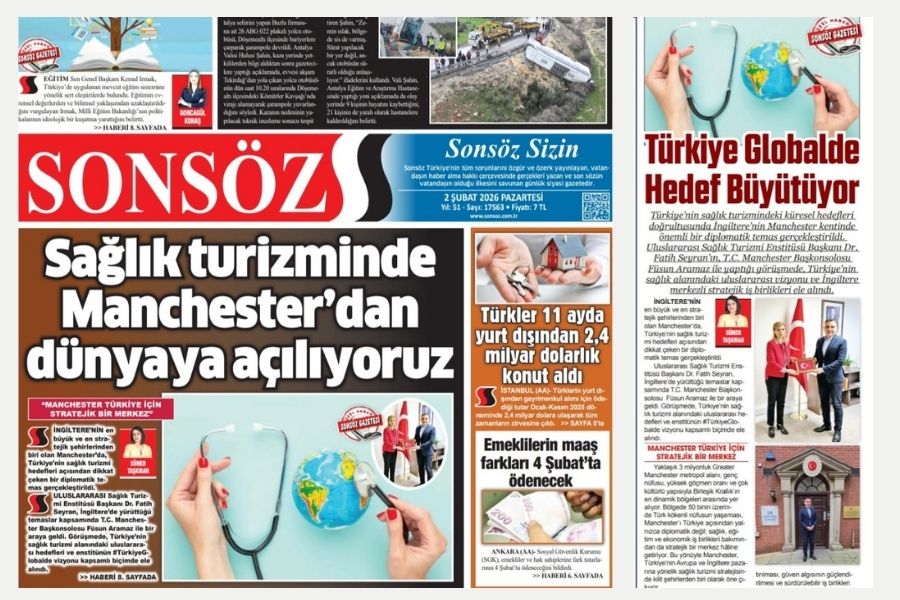 Türkiye’nin sağlık turizminde küresel ligde söz sahibi olma hedefi, 2 Şubat 2025 tarihli gazetenin ilk sayfasında manşetten yer aldı. Uluslararası Sağlık Turizmi Enstitüsü Başkanı Dr. Fatih Seyran’ın İngiltere’nin en stratejik şehirlerinden biri olan Manchester’da gerçekleştirdiği diplomatik temaslar; Türkiye’nin sağlık altyapısı, uluslararası iş birlikleri ve Avrupa ile Birleşik Krallık merkezli açılım stratejisi çerçevesinde değerlendirilerek kamuoyuna taşındı. Türkiye’nin modern sağlık tesisleri, nitelikli insan kaynağı ve uluslararası standartlardaki hizmet kapasitesiyle küresel sağlık turizmi pazarındaki konumunu güçlendirmeye yönelik adımlar, SONSÖZ Gazetesi’nin manşetinde geniş bir çerçevede ele alındı.